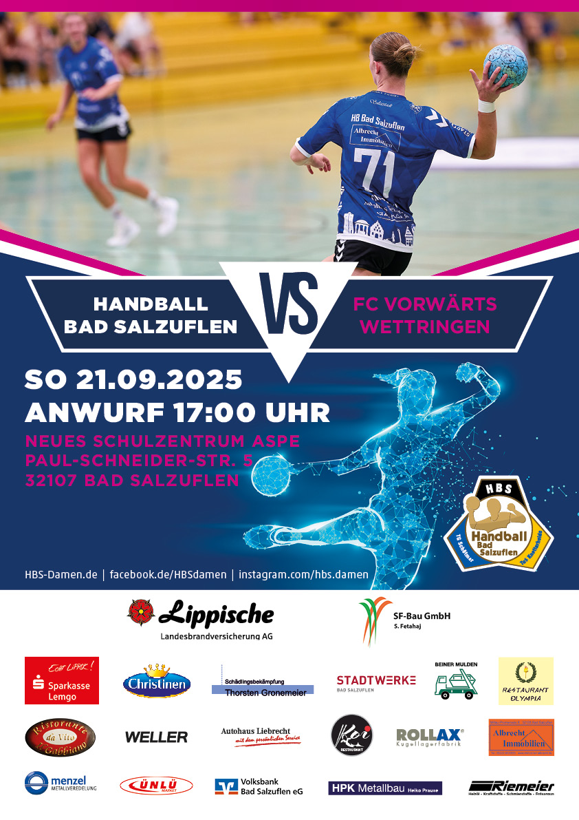 Handball Bad Salzuflen trifft auf FC Vorwärts Wettringen Anwurf: 17:00 Uhr, Halle Aspe